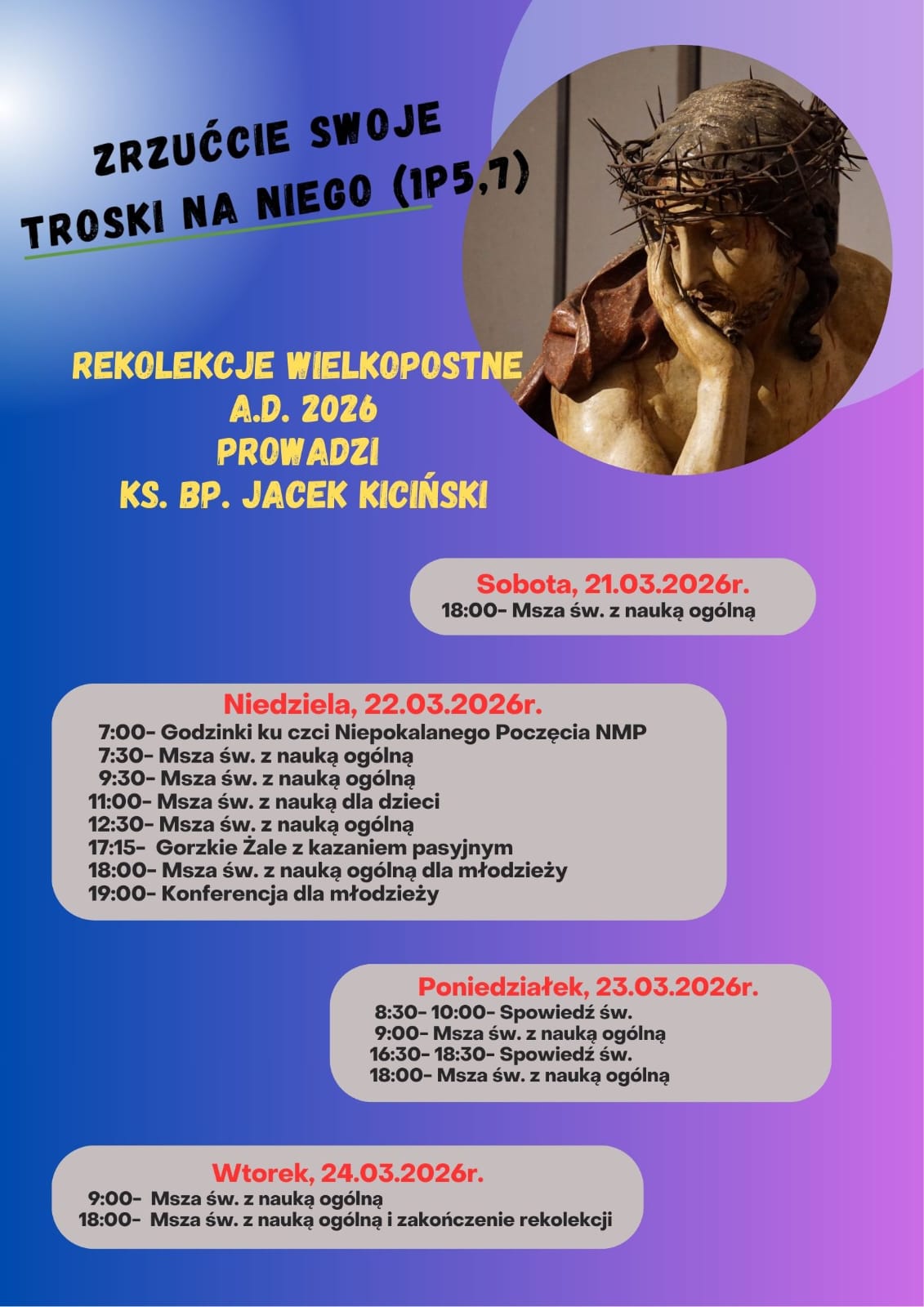 Zapraszamy do udziału w Rekolekcjach Wielkopostnych, które w tym roku będzie głosił Ksiądz Biskup Jacek Kiciński. Plan rekolekcji na załączonym plakacie.